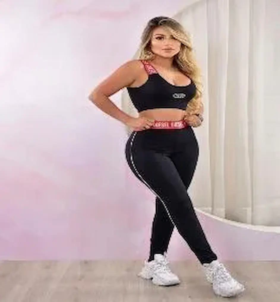 Este outfit destaca por su estética de «activewear» de alto impacto, enfocada en resaltar la figura mediante bloques de color estratégicos: