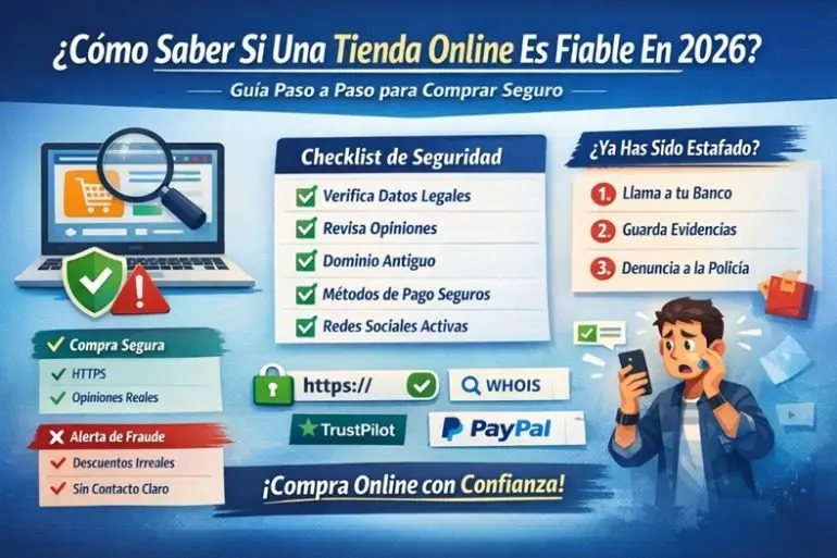 Comprar por internet es cómodo, rápido y, bien hecho, totalmente seguro. El problema no es el e-commerce, sino no saber detectar las señales de alarma antes de pagar. En esta guía actualizada a 2026 te voy a enseñar, paso a paso y sin tecnicismos, cómo saber si una tienda online es fiable, qué herramientas usar y qué hacer si ya has sido víctima de una estafa.